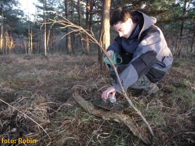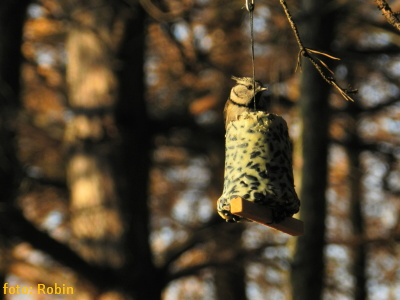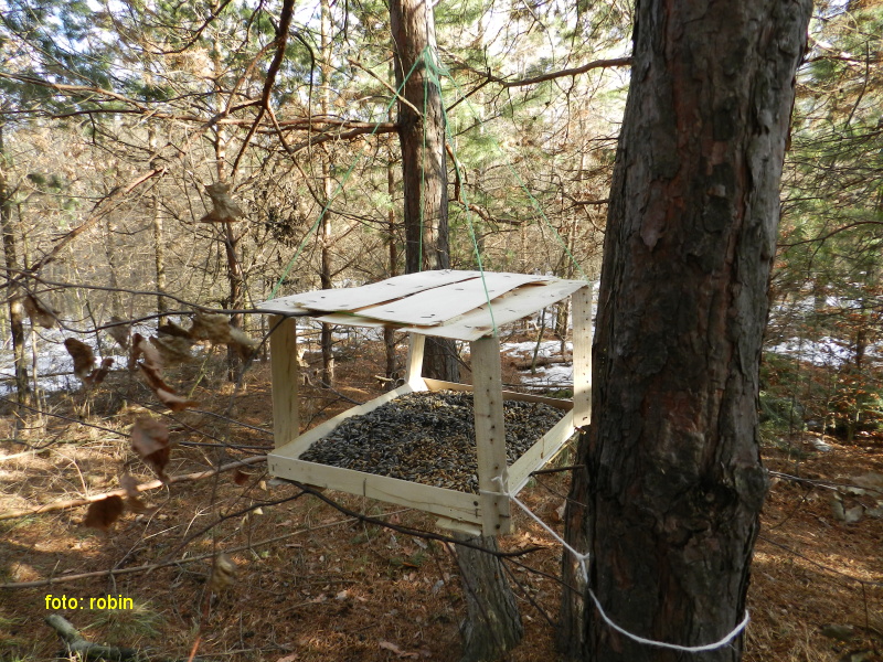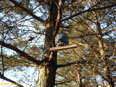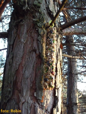 Novo nainštalované krmítko pre drobné spevavce, vyrobené recykláciou drevených bedničiek.. (krmná zmes: slnečnica, vtáčí zob a proso, pre zväčšenie možností okruhu druhov spevavcov na krmítku)